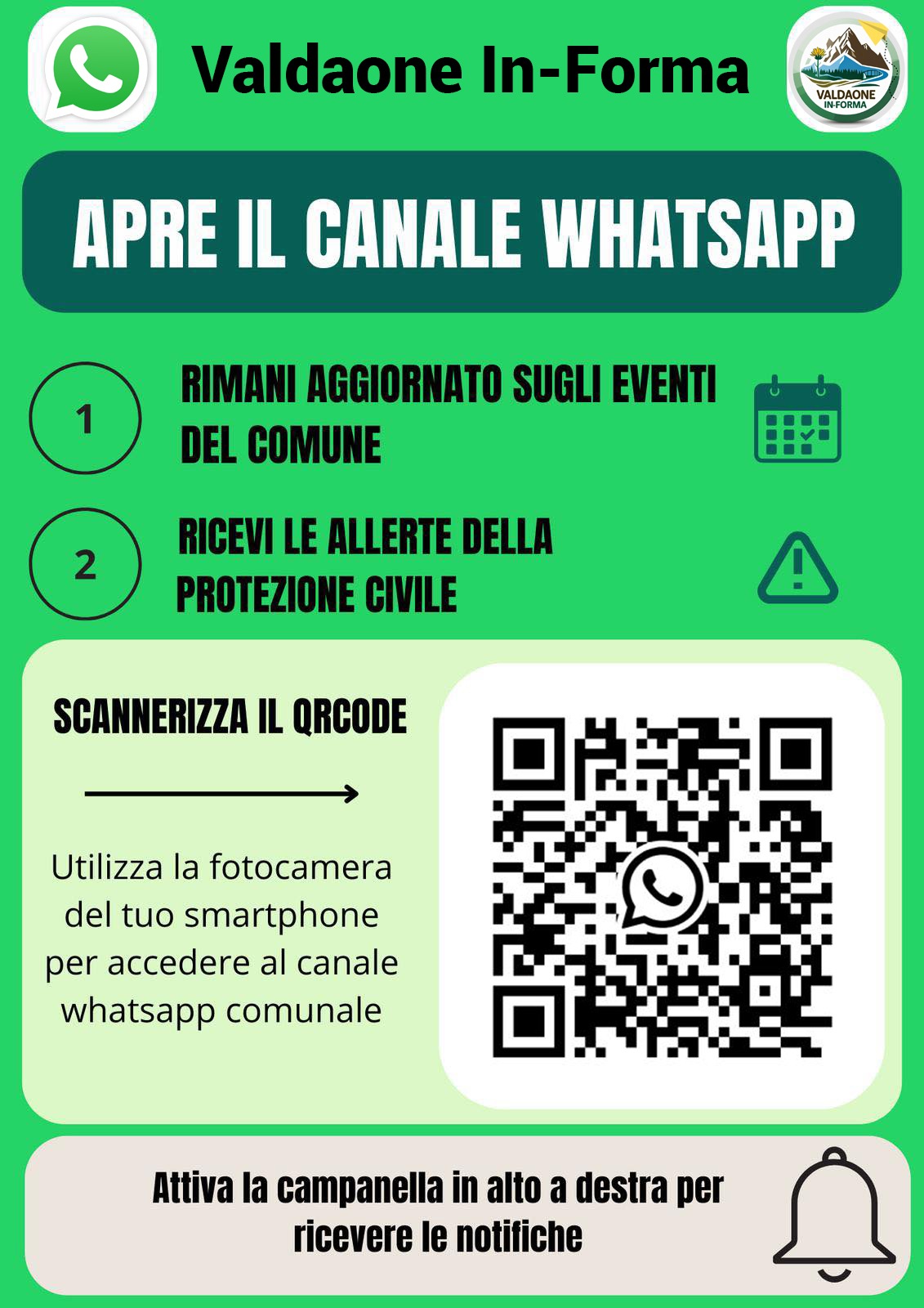 Per rimanere informato in modo tempestivo sulle allerte meteo, sugli eventi nel territorio, sui bandi comunali e tanto altro ancora iscriviti al nuovo Canale WhatsApp.