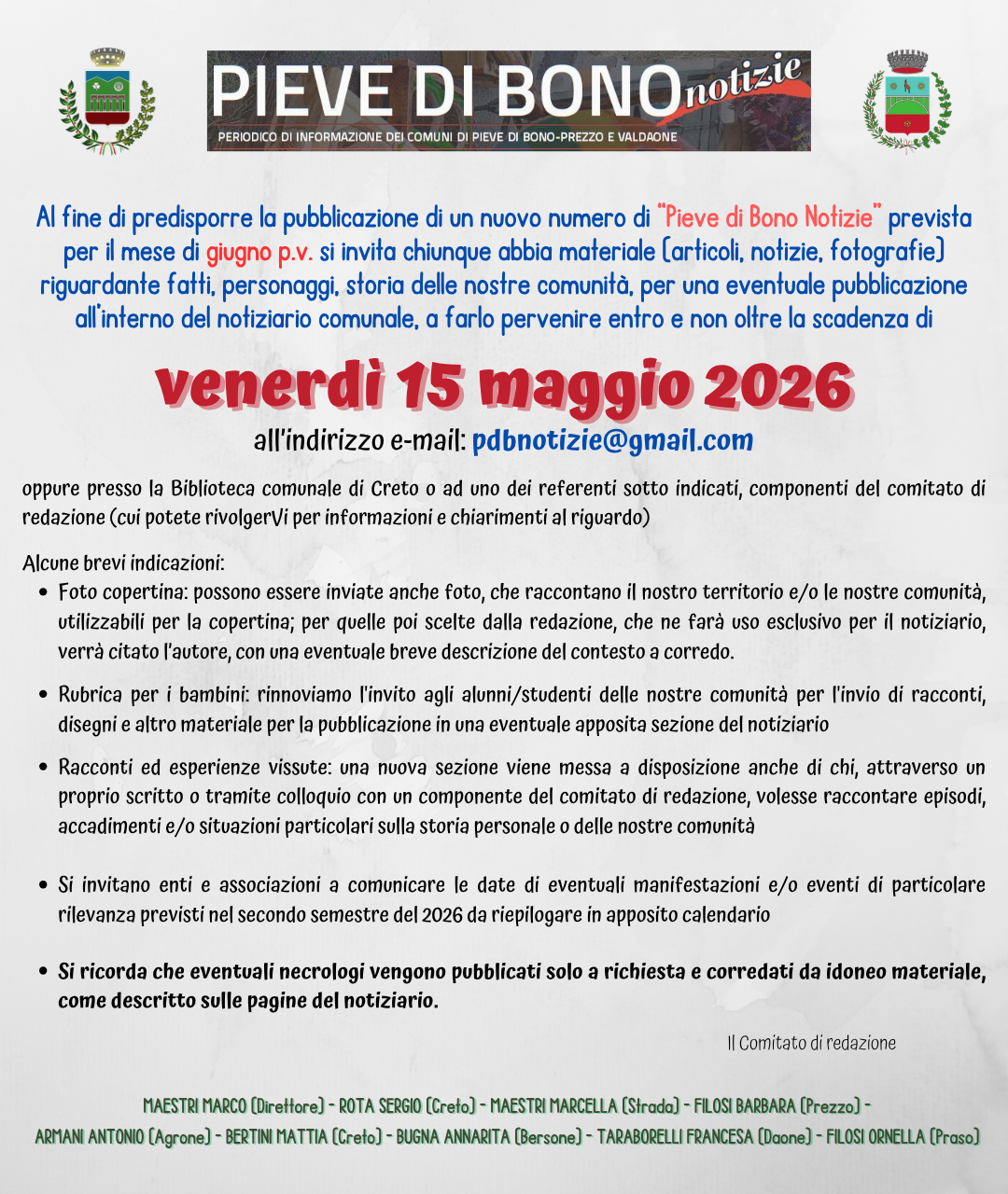 Al fine di predisporre la pubblicazione di un nuovo numero di "Pieve di Bono Notizie" prevista per il mese di giugno 2026 si invita chiunque abbia materiale per una eventuale pubblicazione all'interno del notiziario comunale a farlo pervenire entro e non oltre la scadenza di venerdì 15 maggio 2026 all'indirizzo e-mail pdbnotizie@gmail.com oppure presso la Biblioteca comunale di Creto oppure ad uno dei referenti indicati nell'avviso allegato alla presente comunicazione.