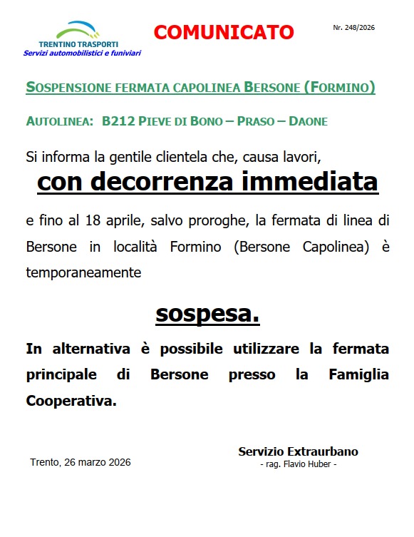 Si informa che a causa di lavori, con decorrenza immediata e fino al 18 aprile 2026, salvo proroghe, la fermata capolinea di Bersone in località Formino è temporaneamente sospesa.