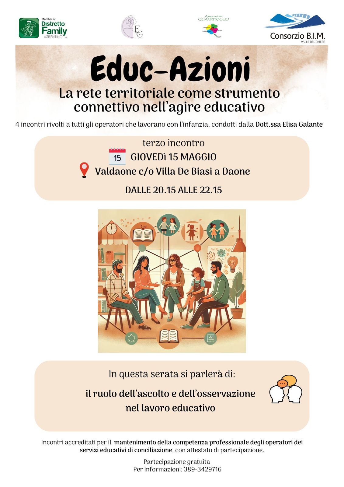 Si segnala che si tratta di incontri accreditati per il mantenimento della competenza professionale degli operatori dei servizi educativi di conciliazione, con attestato di partecipazione.