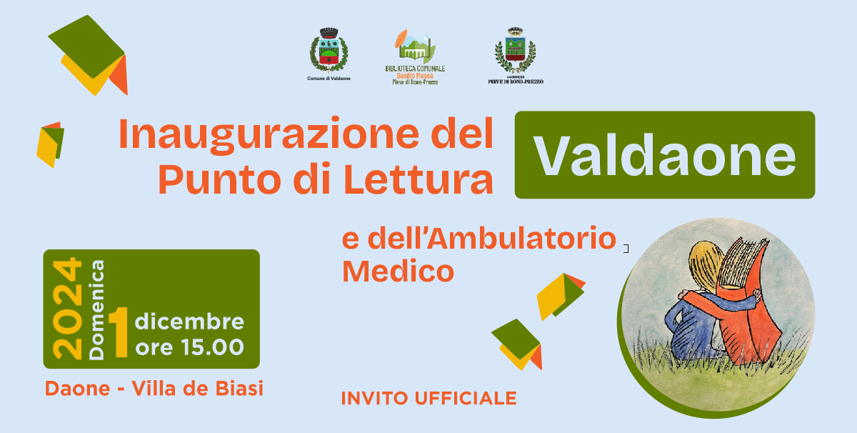 Con la presente, siamo lieti di invitarLa all'inaugurazione del nuovo punto di lettura e della nuova sede dell'ambulatorio medico del Comune di Valdaone, che si terrà il giorno 1° dicembre 2024, alle ore 15:00, presso Villa de Biasi a Daone.