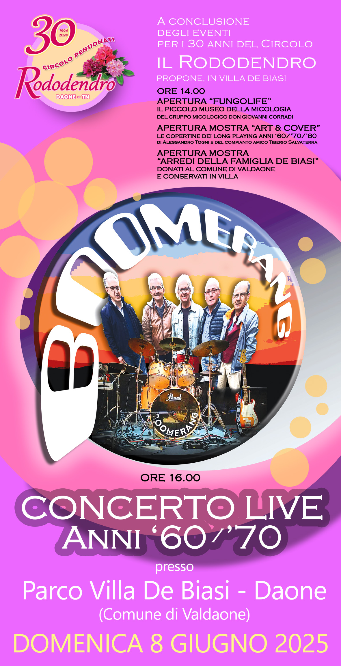 - Concerto live anni '60/'70 con il gruppo musicale "Boomerang" presso il parco della Villa.